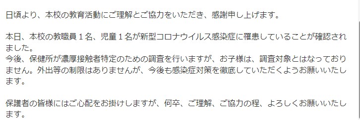 娘の学校からも感染者のお知らせが